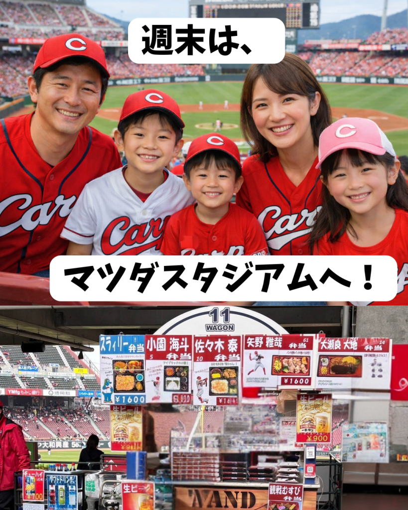 カープ選手弁当を片手に、スタジアムで野球を見る。